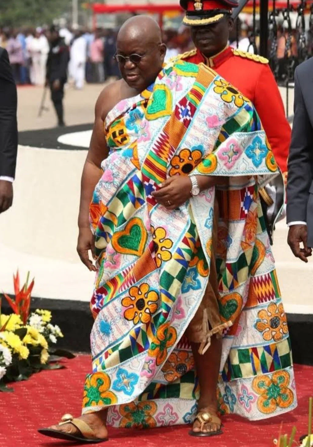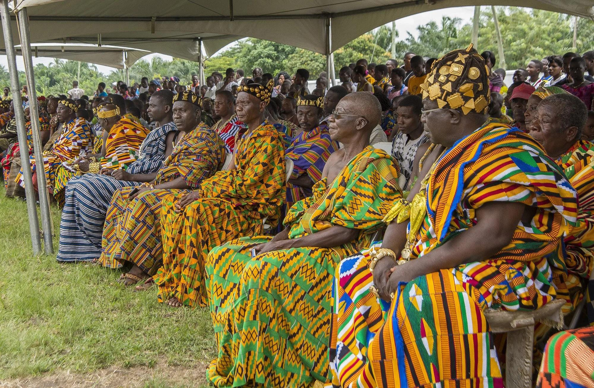 • Patterns with meaning: Kente motifs convey stories and proverbs. Pattern names like Obaakofoo Mmuman ("one person does not rule a nation”) and Emaa Da ("it has never happened before") encode wisdom. The cloth thus becomes a narrative medium: elders and chiefs select patterns to mark occasions like coronations or to honour social values. The use of colour, too, is symbolic; gold signifies status and glory, green evokes renewal and fertility, blue stands for spiritual purity, and red often marks sacrifice.